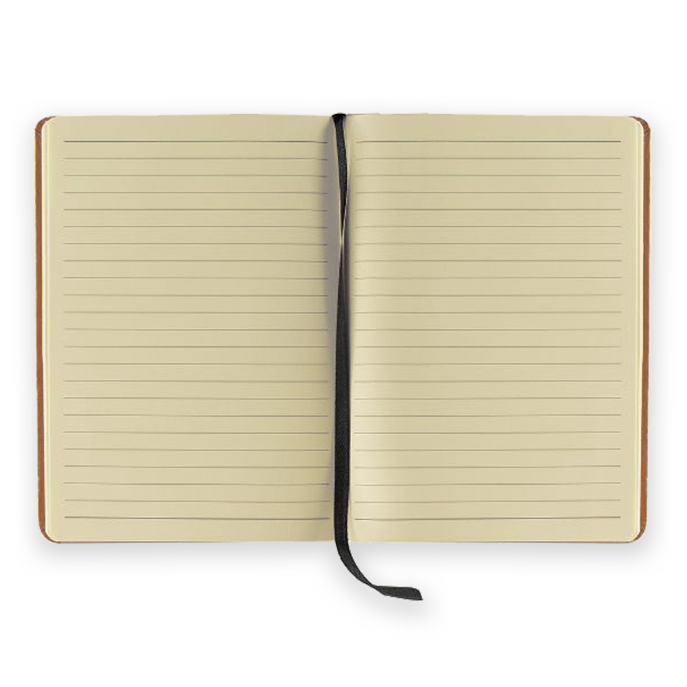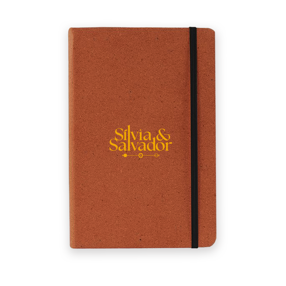 Producto: libreta A5 de tapa dura elaborada de cuero reciclado, interior de hojas color crema rayadas y marcapáginas.